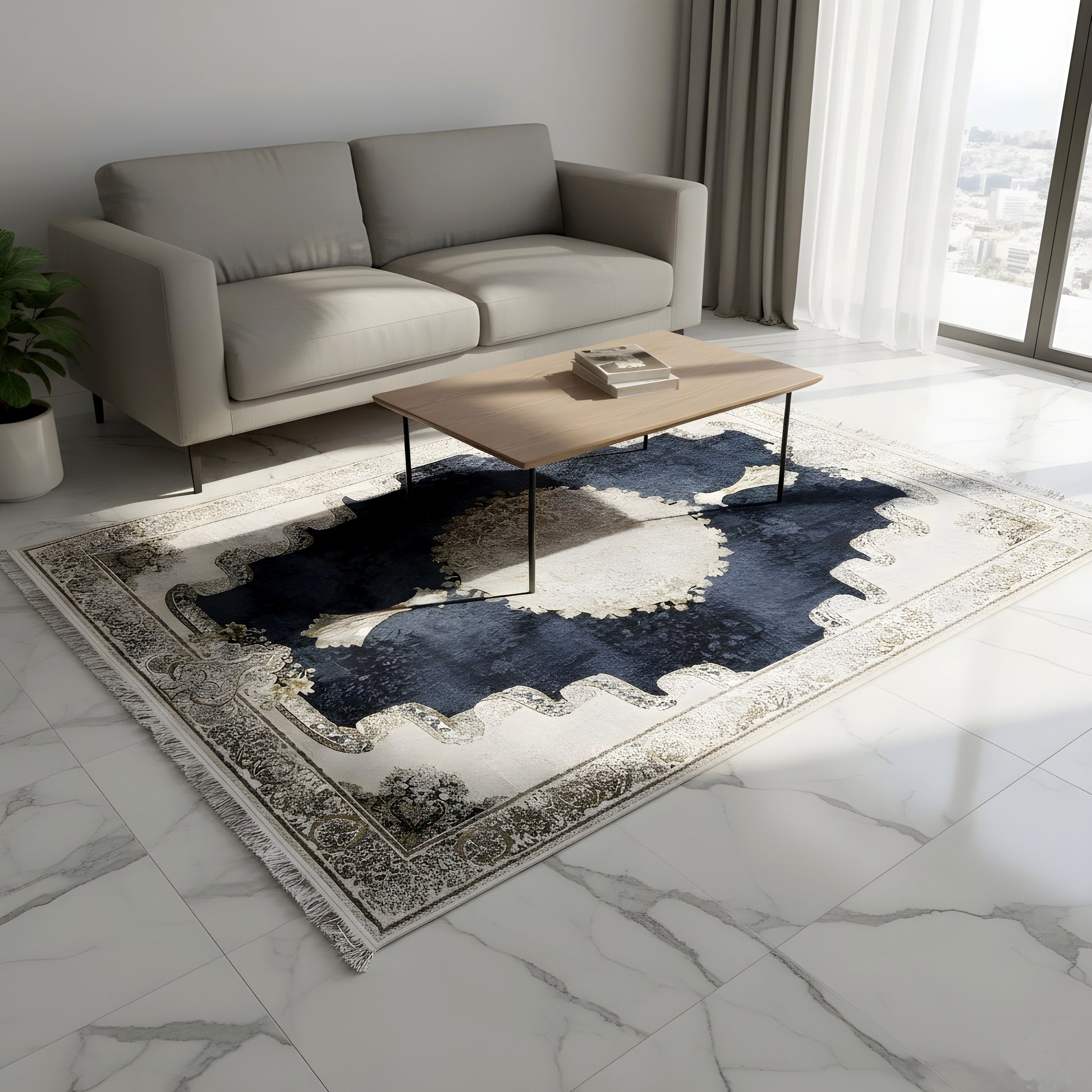Werten Sie Ihr Zuhause mit dem markanten klassischen Arcadian Dusk Teppich auf. Sein raffiniertes marineblaues Innenfeld wird von einer helleren, metallischen Bordüre wunderschön eingerahmt, was einen dramatischen Blickfang schafft. Das zentrale Medaillon und die detaillierte Bordüre verleihen diesem Teppich ein Element von kunstvollem, traditionellem Design. Gefertigt aus 100% hitzebehandeltem Acryl, bietet dieser Teppich ein luxuriöses Gefühl und ist perfekt für stark frequentierte Bereiche, da er zeitlosen Stil mit moderner Widerstandsfähigkeit verbindet. Die großzügige Größe von 170x240cm ist ideal, um Ihr Wohn- oder Schlafzimmer zu definieren.