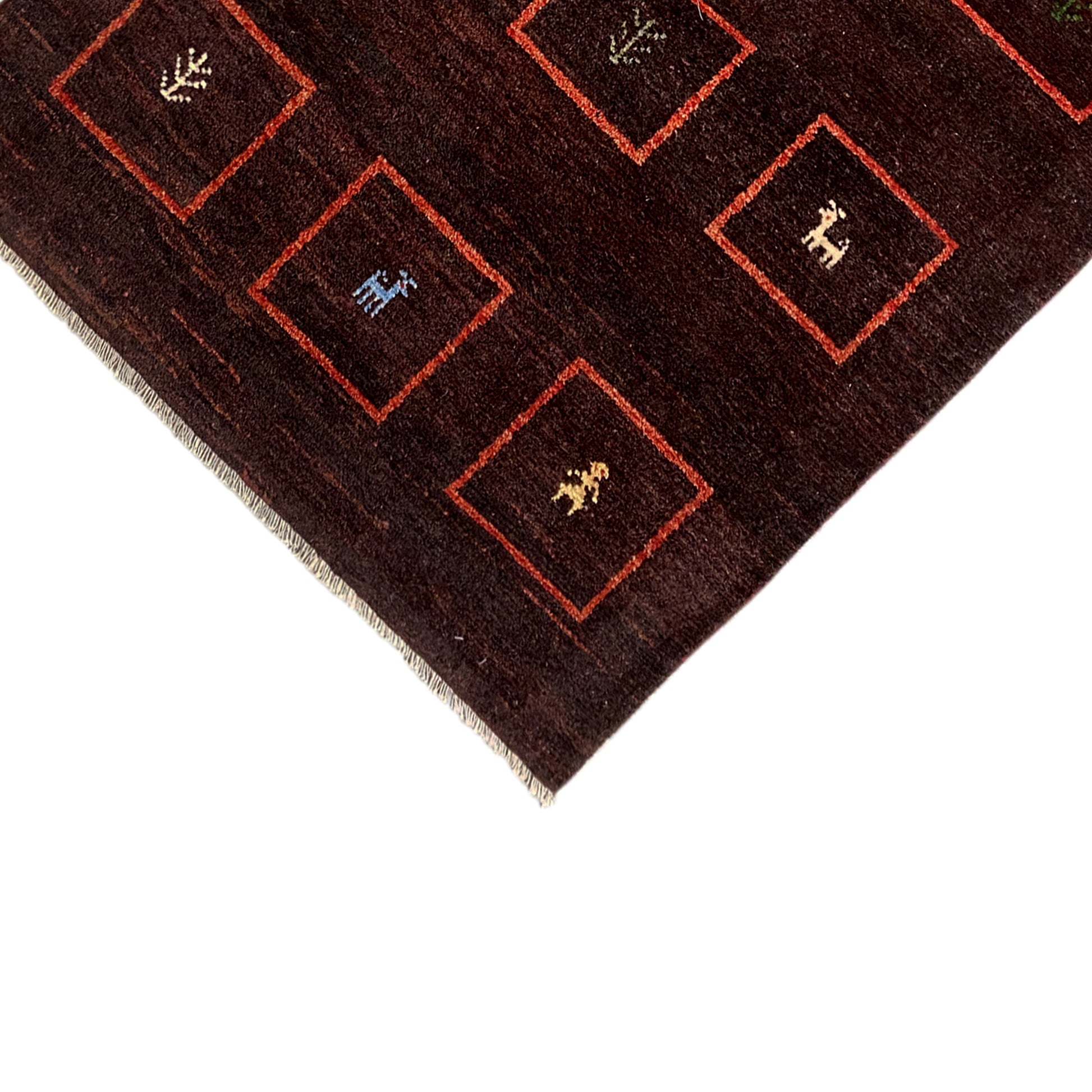 Dieser ausdrucksstarke, handgeknüpfte Gabbeh Teppich in der Größe 147x99cm ist aus handgesponnener, pflanzengefärbter Wolle gefertigt und besticht durch ein tiefes Braun als Hauptfarbe. Sein traditionelles Gittermuster präsentiert in jedem roten Quadrat einzigartige, stilisierte Tier- und Figuren-Motive, die eine Geschichte erzählen. Dieser Teppich bringt authentische Wärme und einen rustikalen, tribalistischen Charme in jedes Zuhause und ist ein langlebiges Unikat.