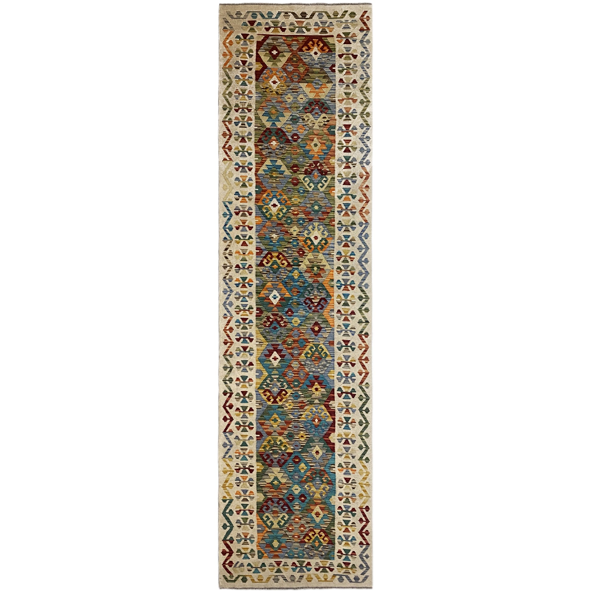 Dieser einzigartige, handgewebte Kelim Afghan Läufer in der Größe 386x87cm ist aus handgesponnener Wolle gefertigt. Das zentrale, multi-farbige Feld zeichnet sich durch ein komplexes, geometrisches Rauten- und Zickzackmuster aus, das von breiten, beigen Rändern mit kleineren tribalistischen Motiven eingerahmt wird. Perfekt für lange Flure und Korridore, verleiht dieser Läufer jedem Raum einen lebendigen, ethnischen Charme und die robuste Schönheit traditioneller afghanischer Handwerkskunst.