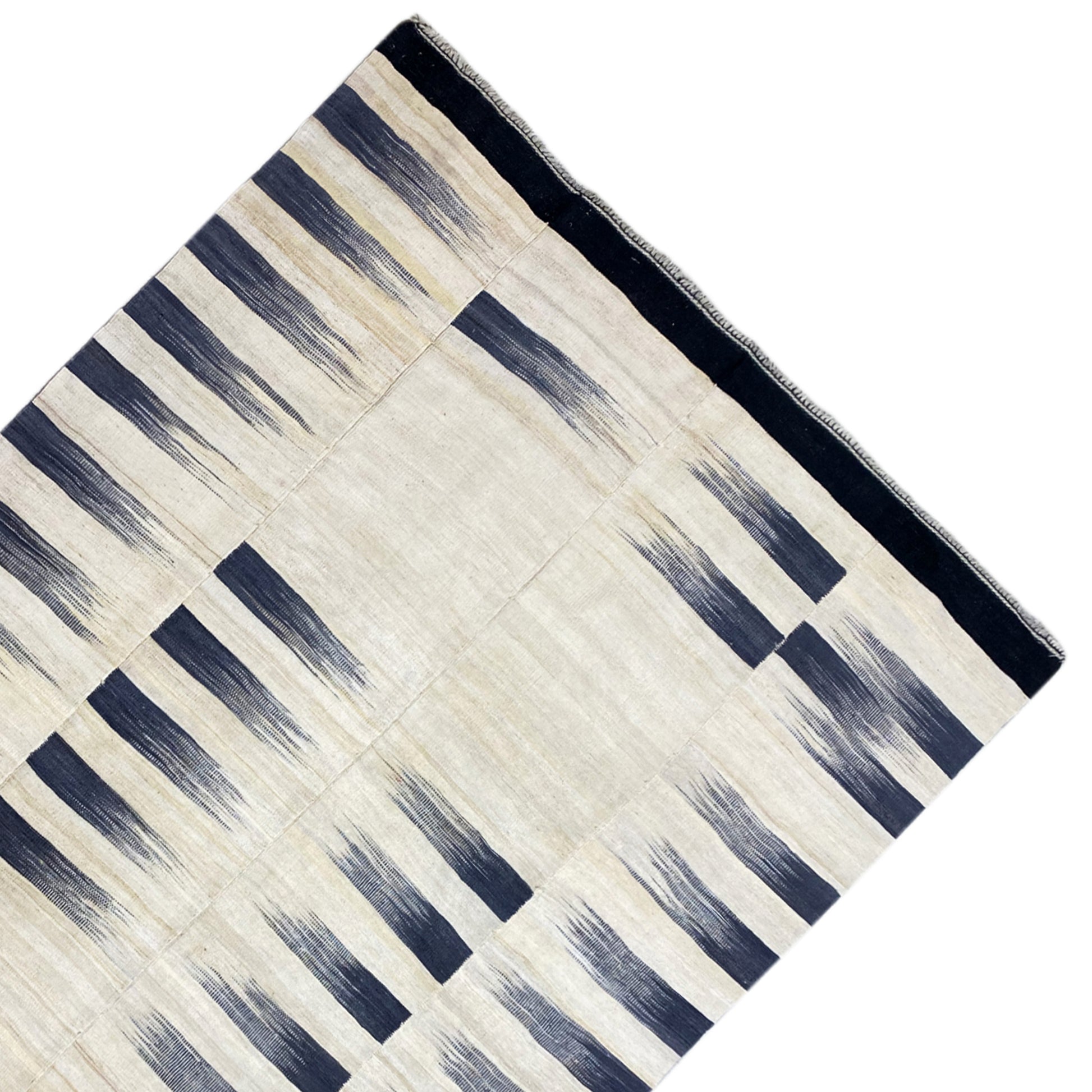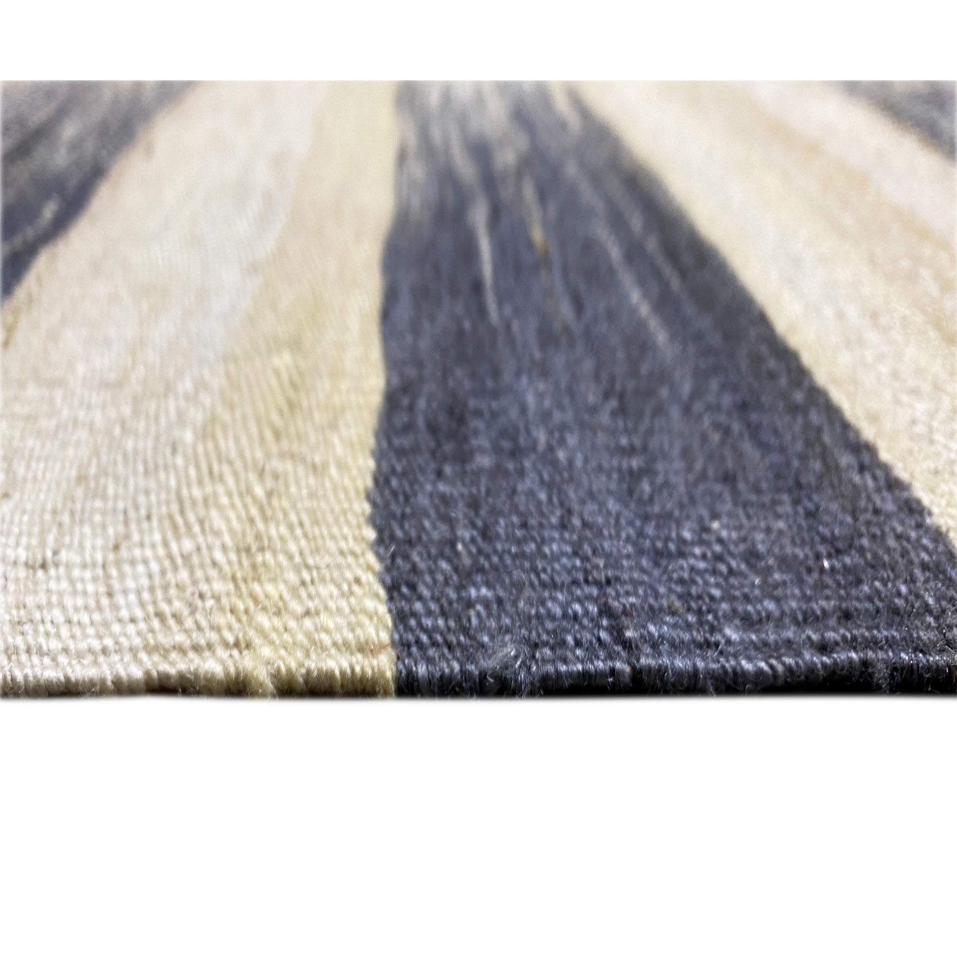 Dieser moderne Flachgewebe-Kelim, mit den Maßen 315x198 cm, ist eine stilvolle Ergänzung für jedes Interieur. Gefertigt aus hochwertiger Wolle mit einer Baumwollkette, bietet er Langlebigkeit und eine angenehme Haptik. Sein einzigartiges Streifenmuster in Beige und Dunkelblau passt perfekt zu einem modernen oder minimalistischen Einrichtungsstil und schafft eine beruhigende, gleichzeitig aber ausdrucksstarke Atmosphäre. Ideal, um jedem Raum eine zeitgemäße Eleganz zu verleihen.