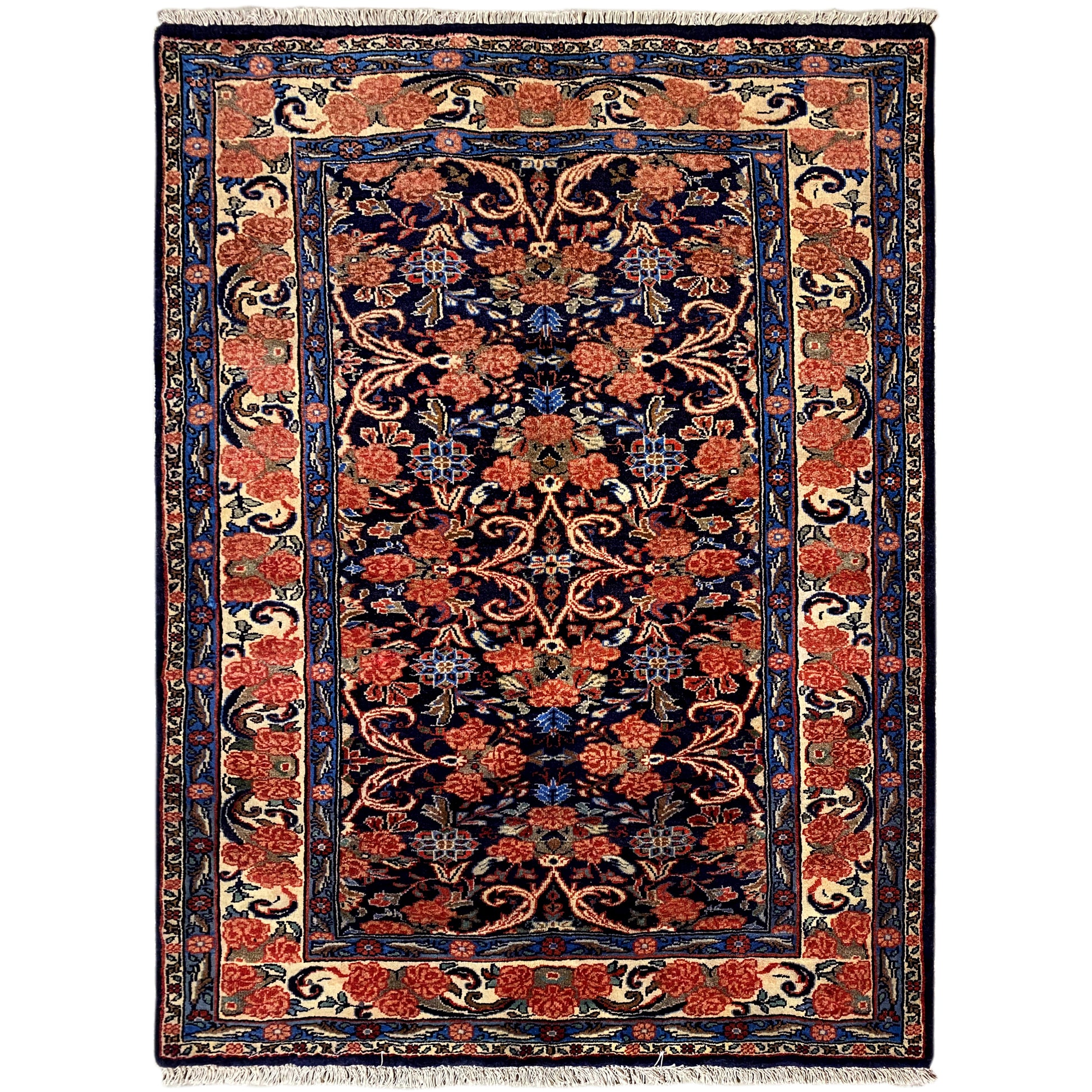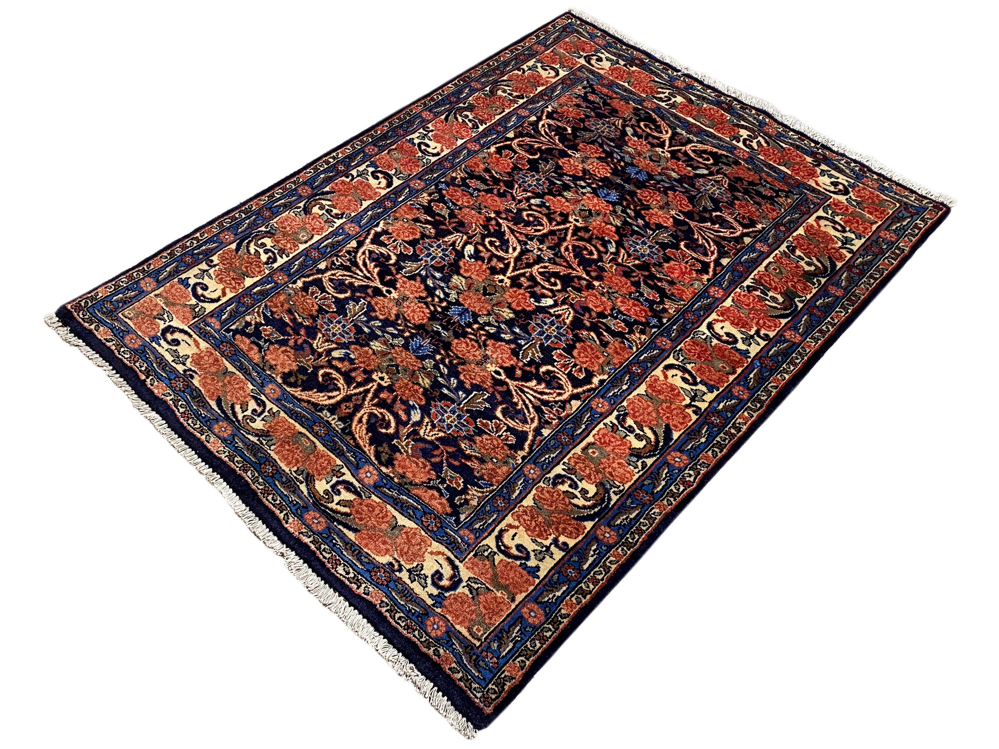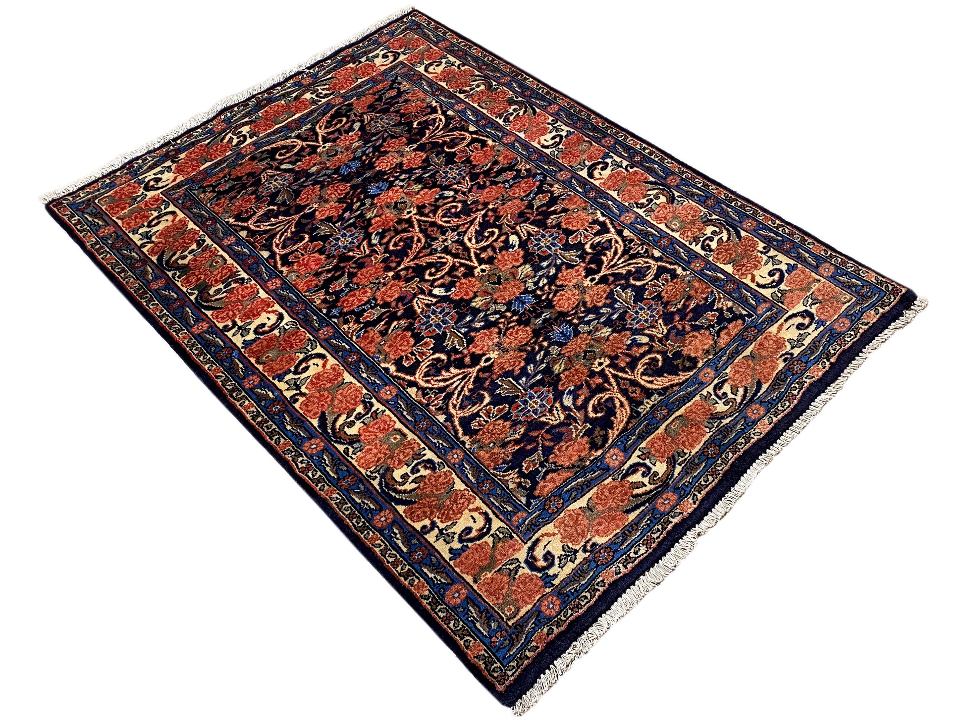 Dieser handgeknüpfte Hamedan Teppich aus handgesponnener Wolle vereint traditionelle persische Handwerkskunst mit einem eleganten floralen Muster und setzt in klassischen wie modernen Wohnräumen stilvolle Akzente; das kompakte Format von 142x102 cm passt ideal in Wohnzimmer, Flur oder Schlafzimmer, während die dunkle Blaugrundfarbe mit warmen Rot- und Beigetönen dem Raum Tiefe, Wärme und Charakter verleiht – ein langlebiger, hochwertiger Teppich, der durch seine robuste Knotendichte von 160.000 Knoten/qm, zeitlose Optik und vielseitige Einsatzmöglichkeiten überzeugt.