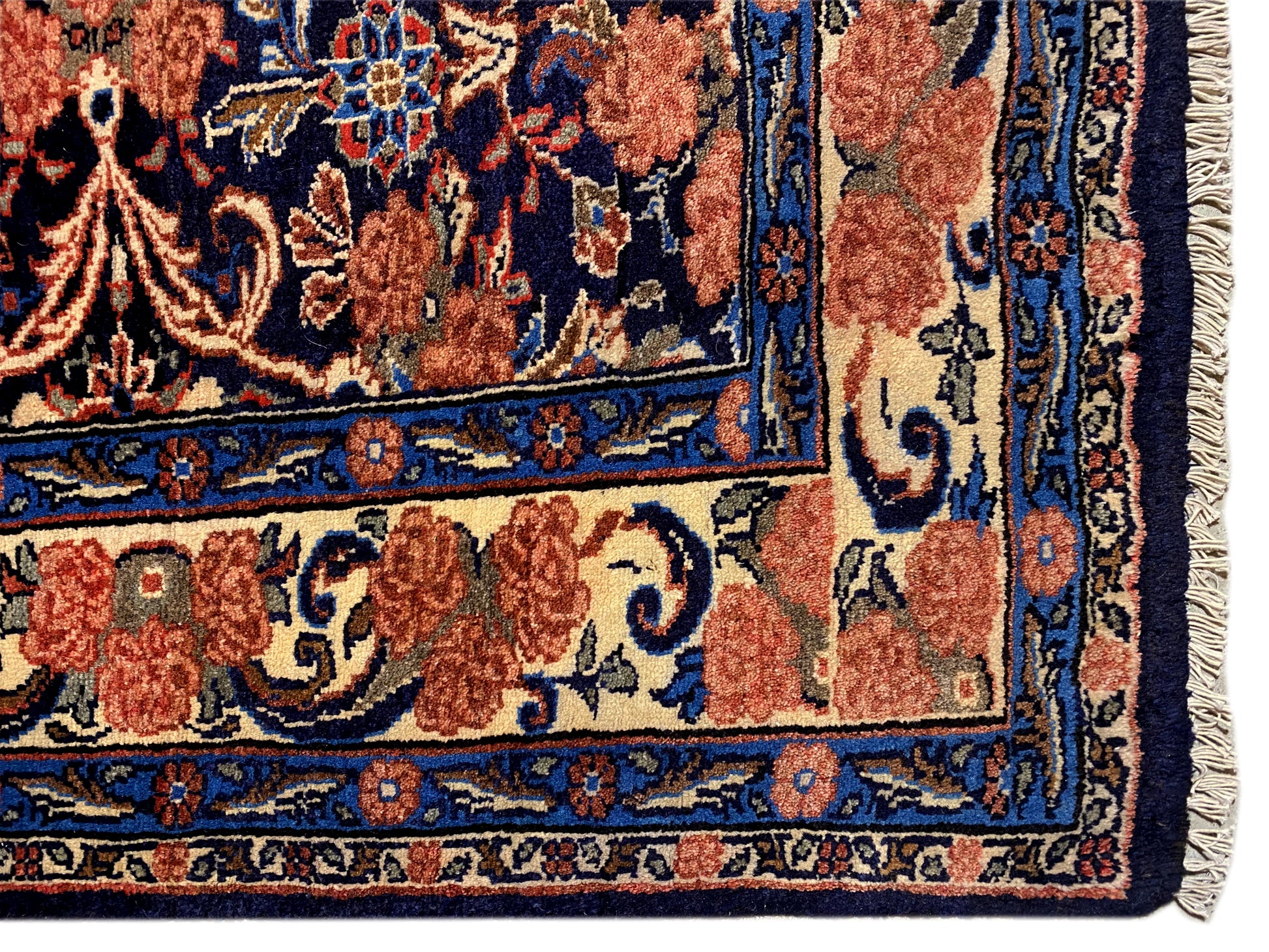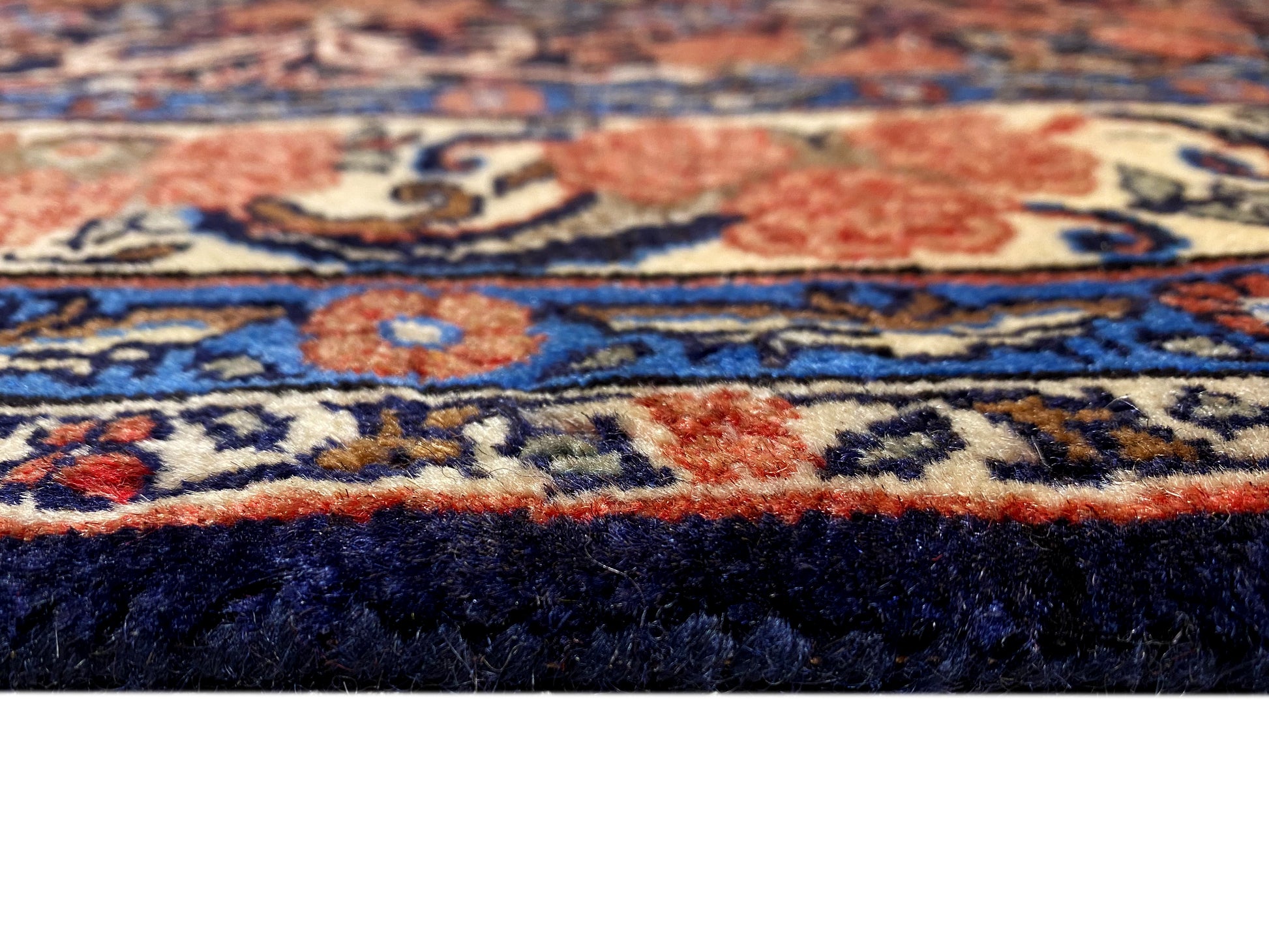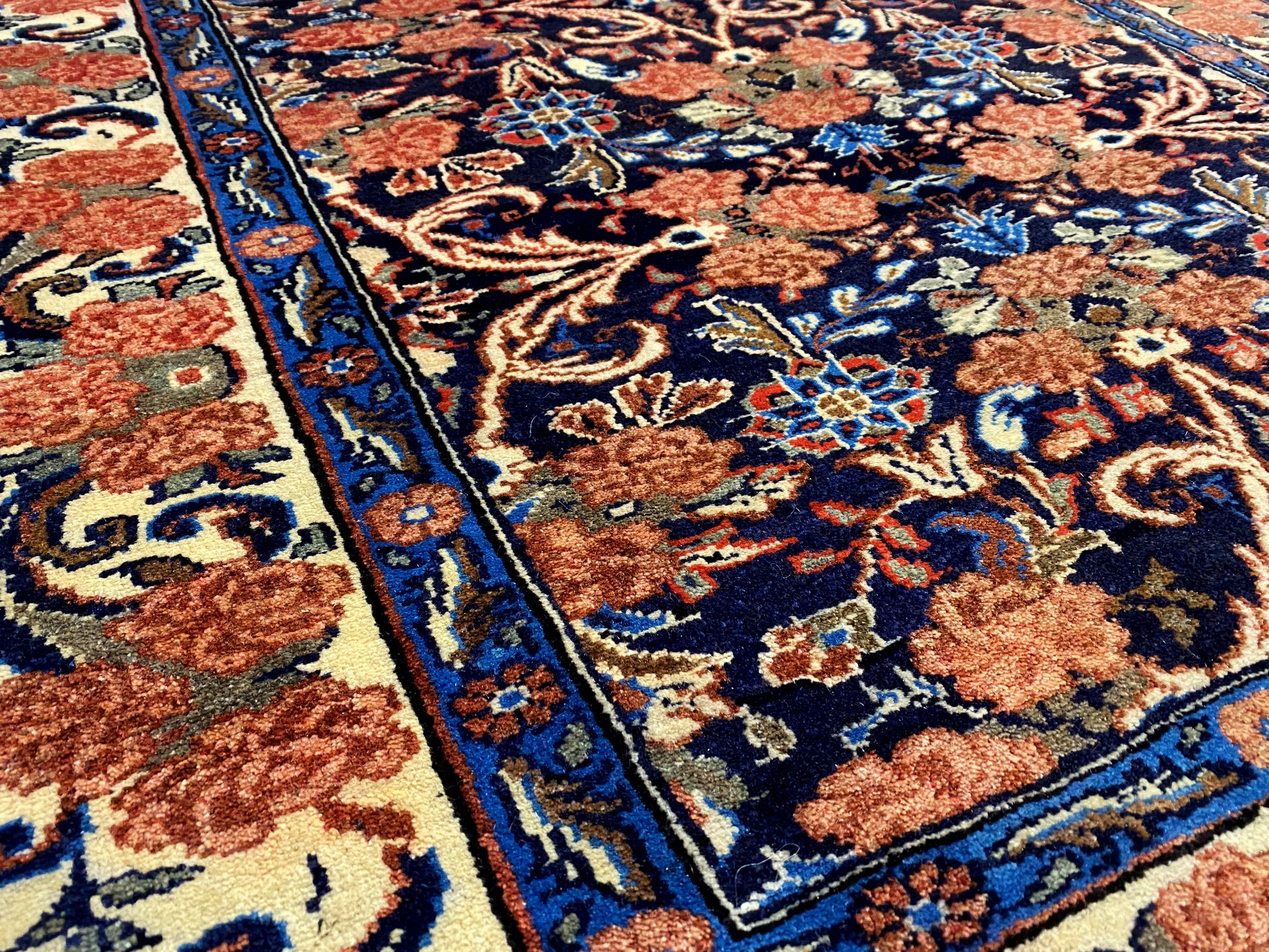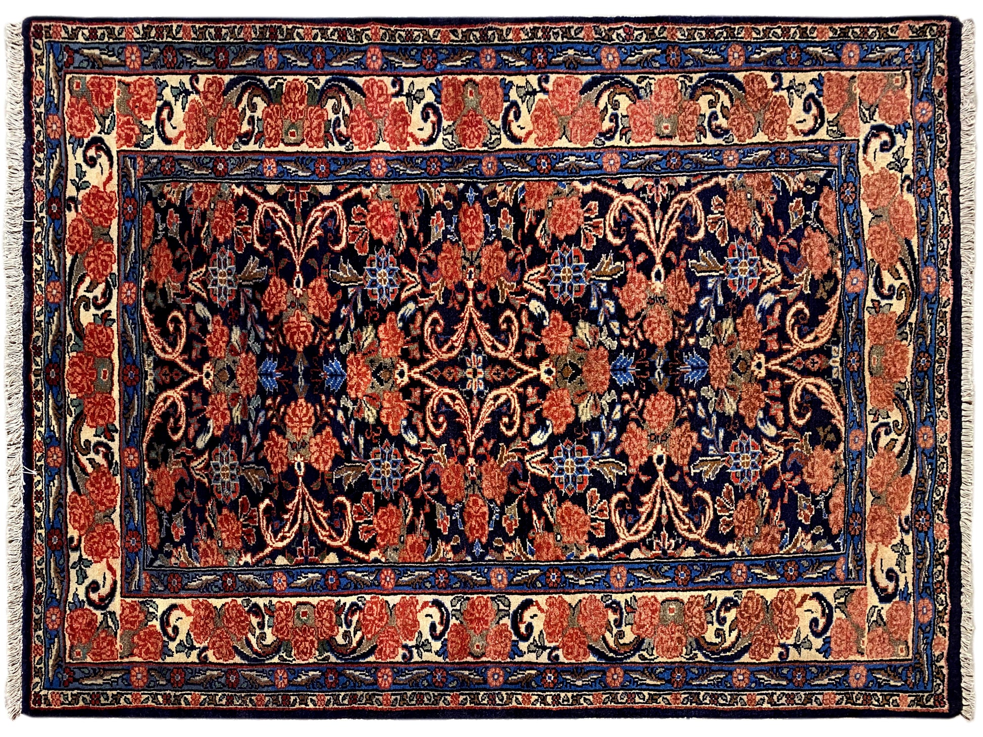 Dieser handgeknüpfte Hamedan Teppich aus handgesponnener Wolle vereint traditionelle persische Handwerkskunst mit einem eleganten floralen Muster und setzt in klassischen wie modernen Wohnräumen stilvolle Akzente; das kompakte Format von 142x102 cm passt ideal in Wohnzimmer, Flur oder Schlafzimmer, während die dunkle Blaugrundfarbe mit warmen Rot- und Beigetönen dem Raum Tiefe, Wärme und Charakter verleiht – ein langlebiger, hochwertiger Teppich, der durch seine robuste Knotendichte von 160.000 Knoten/qm, zeitlose Optik und vielseitige Einsatzmöglichkeiten überzeugt.