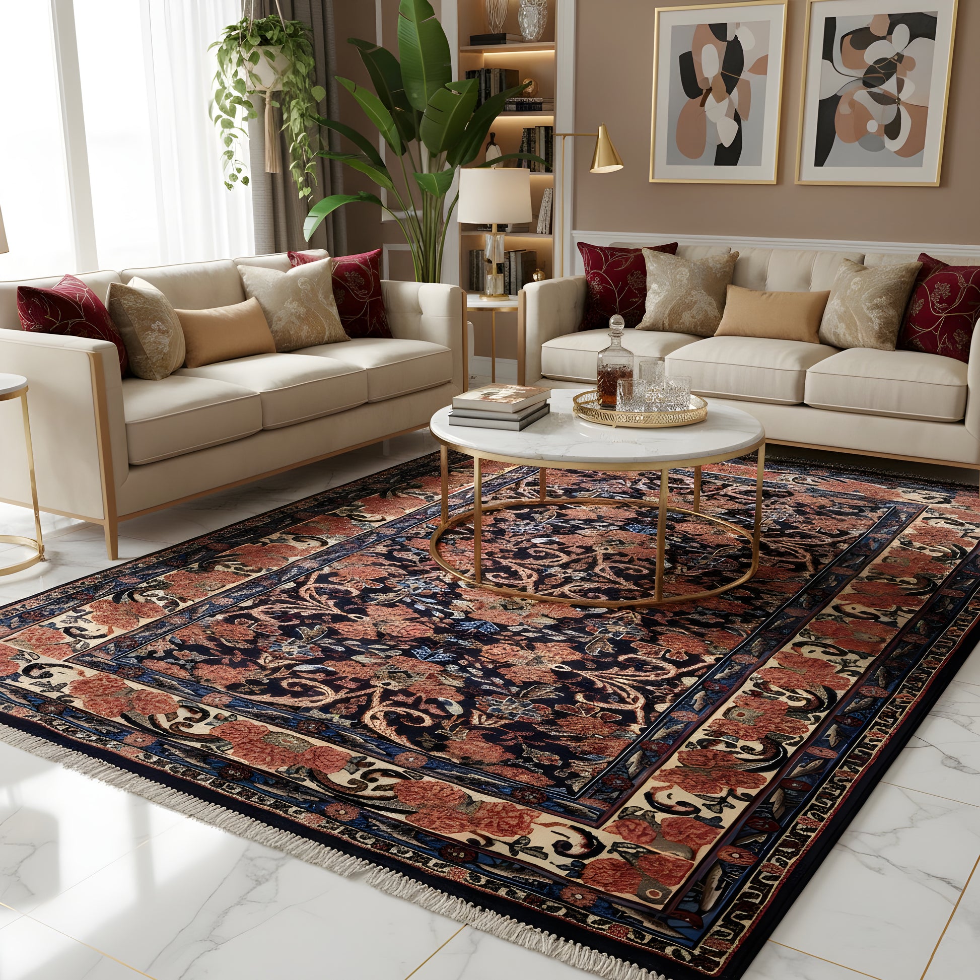 Hinweis: Transportbedingte Falten, wie Sie teilweise auf den Abbildungen zu sehen sind, legen sich innerhalb von wenigen Tagen nach Auslage des Teppichs.